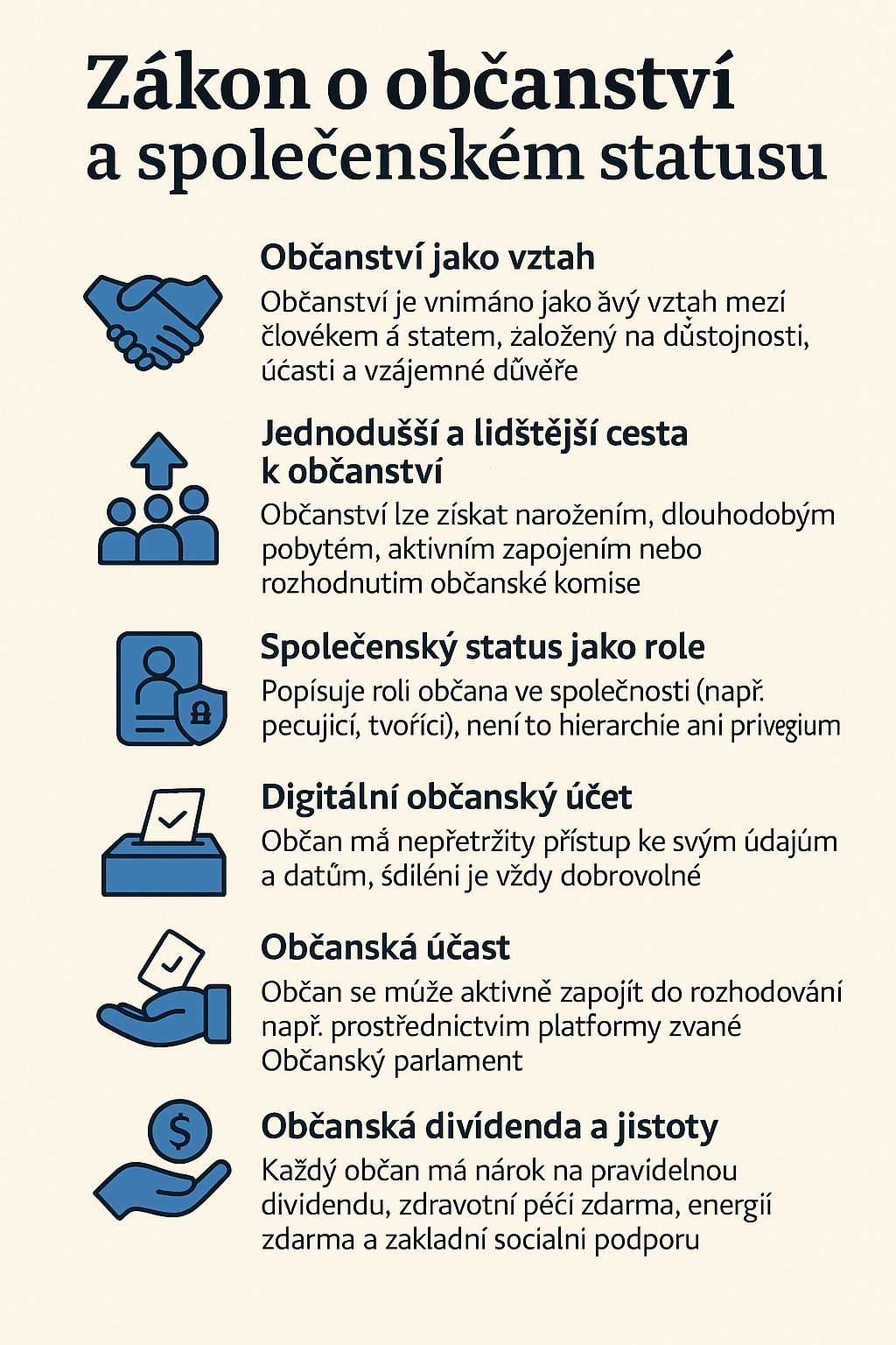 Dnes je občanství hlavně administrativní status. V novém systému je občanství živý vztah mezi člověkem a státem. Stát garantuje jistoty, bezpečí a rovné podmínky. Občan přináší účast, respekt a spolupráci.