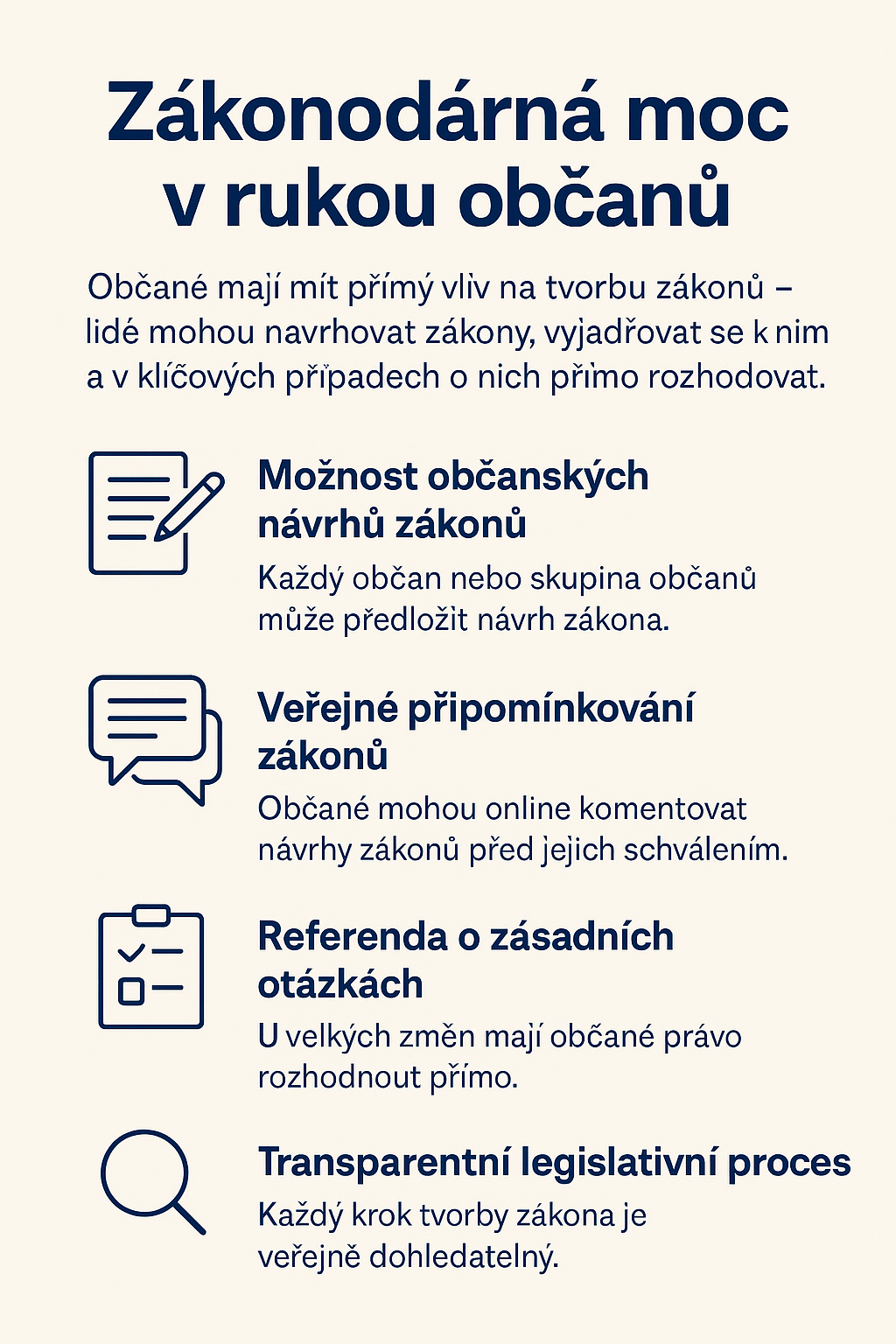 Občané mají mít přímý vliv na tvorbu zákonů — nejen prostřednictvím voleb, ale i během celého volebního období. Lidé mohou navrhovat zákony, vyjadřovat se k nim a v klíčových případech o nich přímo rozhodovat.